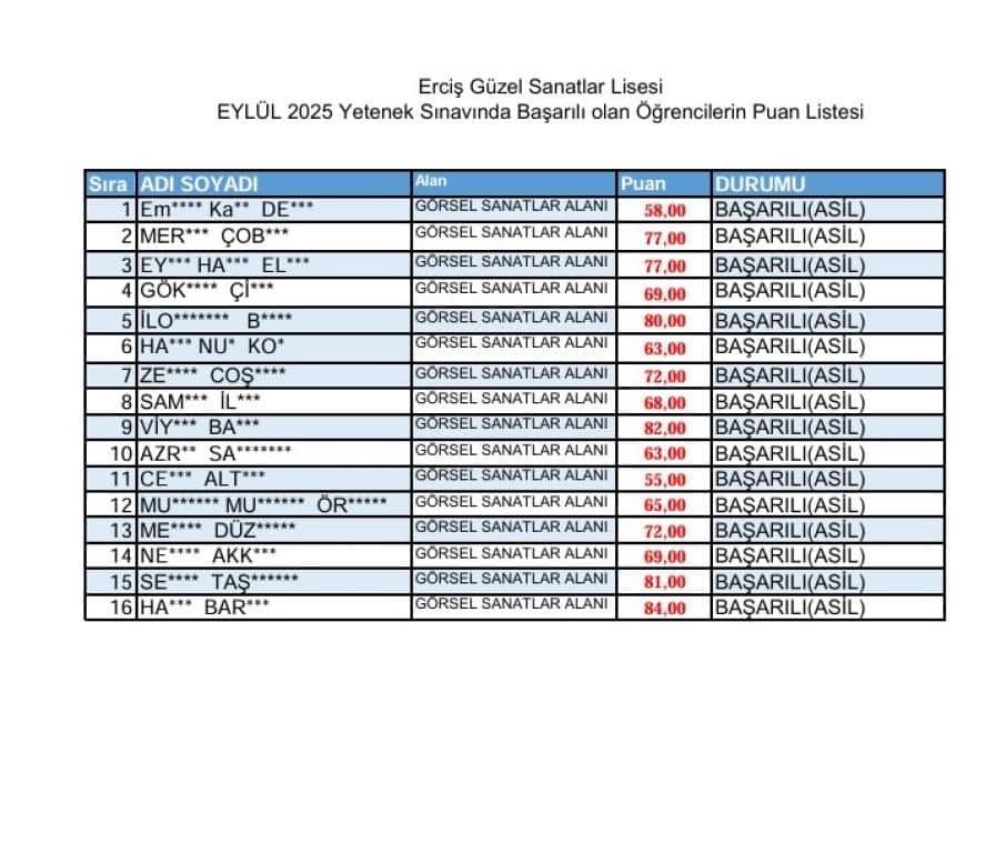 EYLÜL 2025 GÖRSEL SANATLAR EK YETENEK SINAVLARINI KAZANAN ÖĞRENCİLERİN LİSTESİ