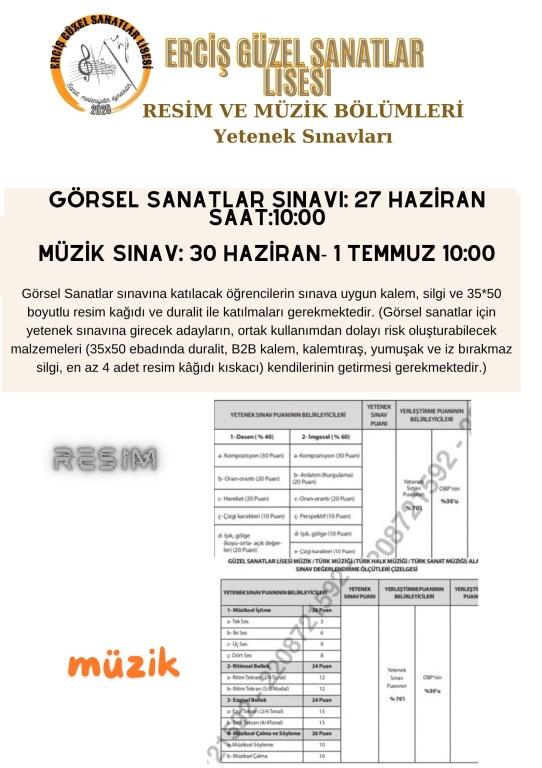 Görsel Sanatlar sınavına katılacak öğrencilerin sınava uygun kalem, silgi ve 35*50 boyutlu resim kağıdı ve duralit ile katılmaları gerekmektedir. (Görsel sanatlar için yetenek sınavına girecek adayların, ortak kullanımdan dolayı risk oluşturabilecek malzemeleri (35x50 ebadında duralit, B2B kalem, kalemtıraş, yumuşak ve iz bırakmaz silgi, en az 4 adet resim kâğıdı kıskacı) kendilerinin getirmesi gerekmektedir.)